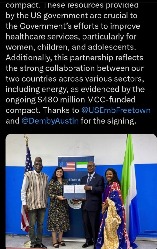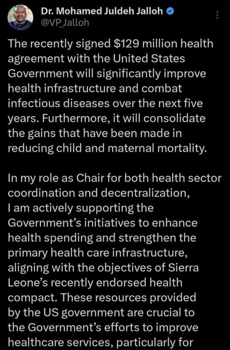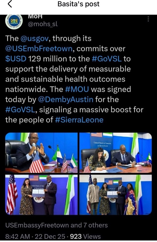 On December 22, 2025, Sierra Leone signed a Memorandum of Understanding (MOU) with the United States on global health cooperation, committing over $129 million in US support over five years. Vice President Dr. Mohamed Juldeh Jalloh hailed it as a boost for health infrastructure, infectious disease control, and reductions in child and maternal mortality. The Ministry of Health on X echoed this, calling it a "massive boost" for measurable and sustainable outcomes.